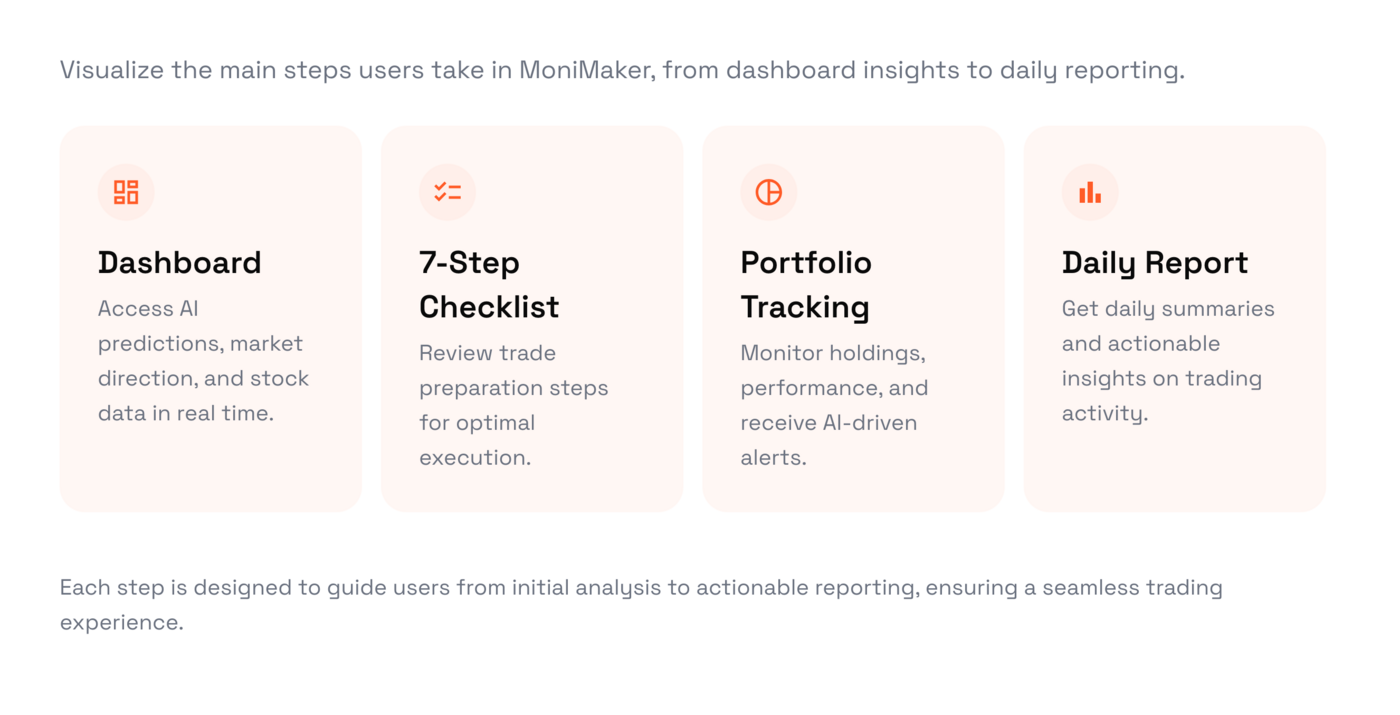 MoniMaker guides you through every step of the trading day, from AI-powered predictions to performance reviews, ensuring you make informed decisions.